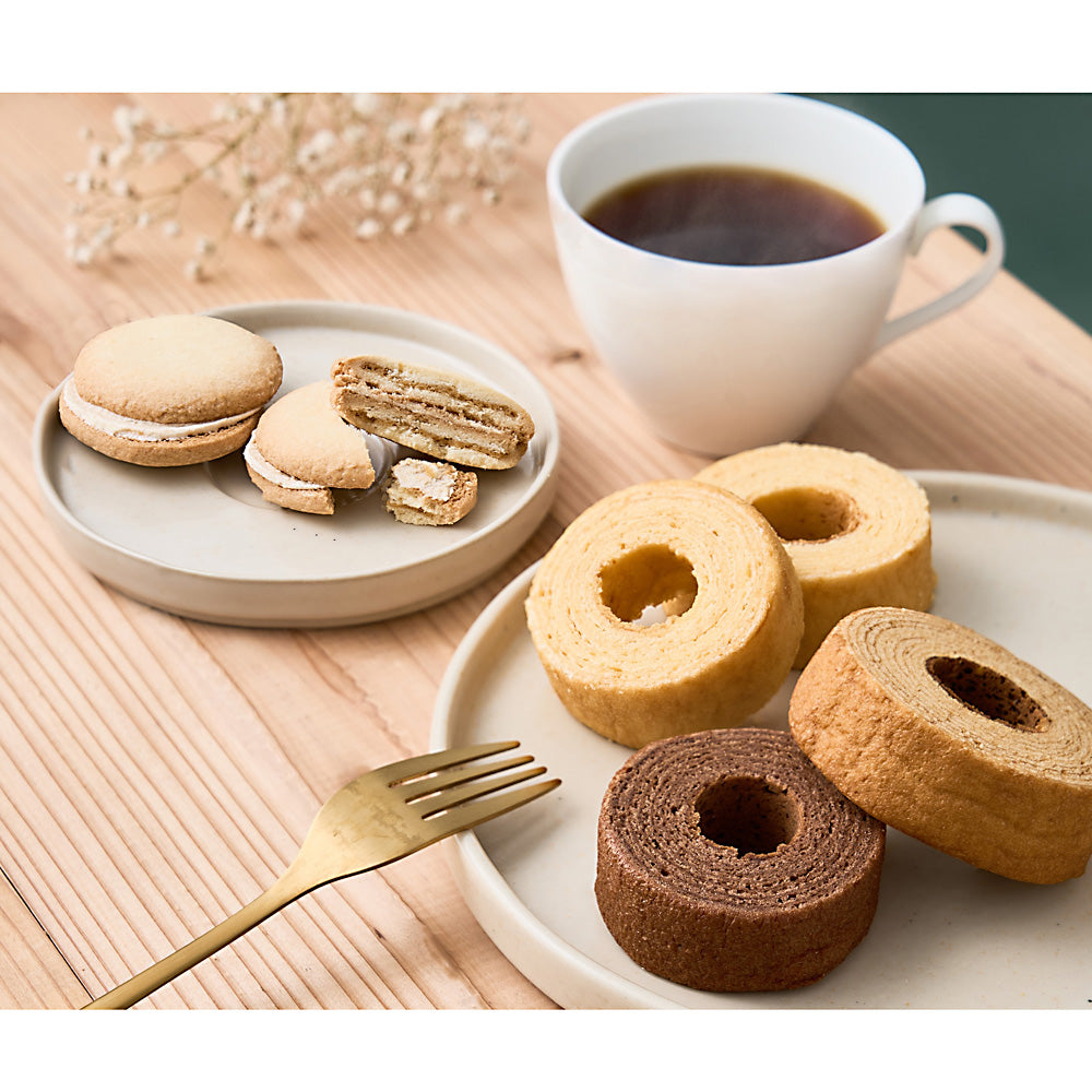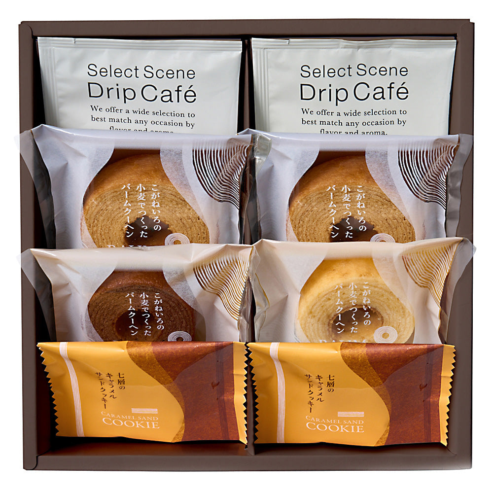 - セット内容:ふんわりバームクーヘン(ミルク・ココア×各1個、黒糖×2個)、七層のキャラメルサンドクッキー×2個、三喜屋珈琲のレギュラーコーヒー×2袋
