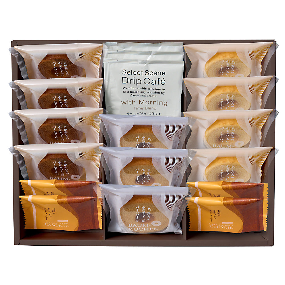 - セット内容:ふんわりバームクーヘン(ミルク・ココア×各4個、黒糖×3個)、七層のキャラメルサンドクッキー×4個、三喜屋珈琲のレギュラーコーヒー×3袋