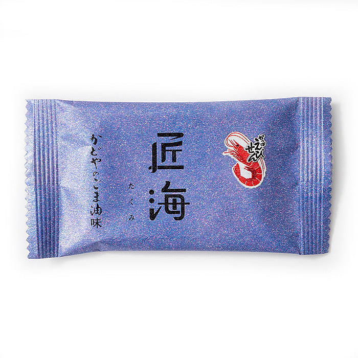 瀬戸内海産の天然エビと瀬戸内で作られた海人の藻塩を使用し、丁寧に作られたこだわりのかっぱえびせんです。「海人の藻塩味」と、焼き上げた後に仕上げに掛ける油に「かどやのごま油」を使用した、エビとごま油の香ばしい香りが口いっぱいに広がる「藻塩とかどやごま油仕立て」の2種類。水揚げされたえびを鮮度を損なわないうちに急速冷凍することで、風味・うま味がそのまま活きています。