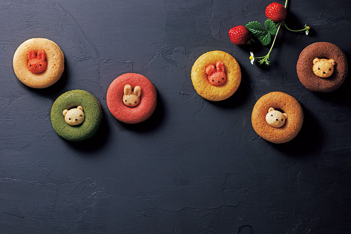いろとりどりなドーナツのまんなかに、かわいらしいウサギとクマをデザインした美味しい&かわいい焼ドーナツです。