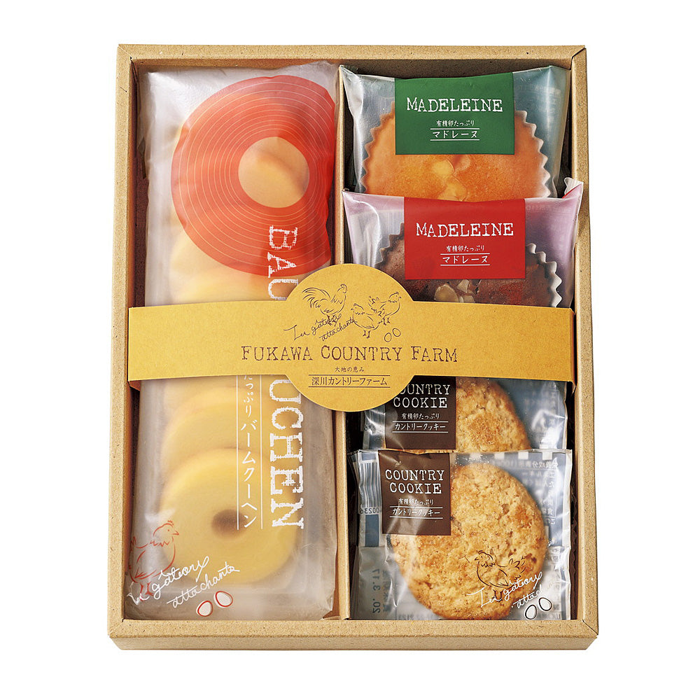 のびのび育った鶏から取れた有精卵を、た~っぷり使った贅沢&こだわりのスイーツを製造・販売している深川カントリーファーム自慢のスイーツセットのご紹介です。ふんわりやさしい口どけが印象的なバームクーヘンや、大人からお子様まで幅広い年代の方に愛されるマドレーヌなど人気の洋菓子を詰め合わせ。