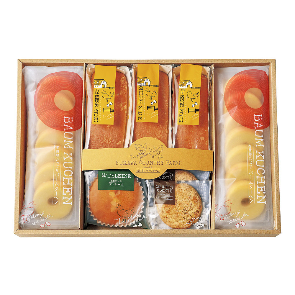 のびのび育った鶏から取れた有精卵を、た~っぷり使った贅沢&こだわりのスイーツを製造・販売している深川カントリーファーム自慢のスイーツセットのご紹介です。ふんわりやさしい口どけが印象的なバームクーヘンや、大人からお子様まで幅広い年代の方に愛されるマドレーヌなど人気の洋菓子を詰め合わせ。