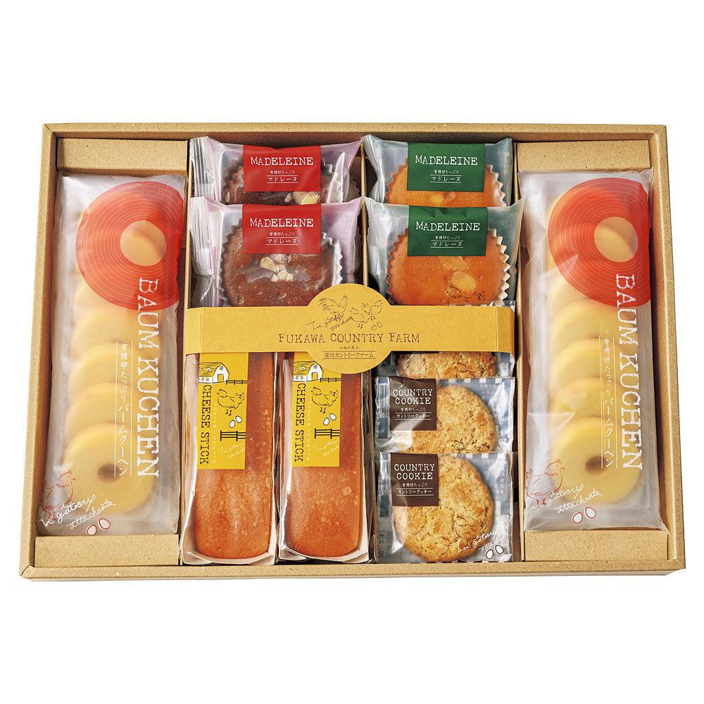 のびのび育った鶏から取れた有精卵を、た~っぷり使った贅沢&こだわりのスイーツを製造・販売している深川カントリーファーム自慢のスイーツセットのご紹介です。ふんわりやさしい口どけが印象的なバームクーヘンや、大人からお子様まで幅広い年代の方に愛されるマドレーヌなど人気の洋菓子を詰め合わせ。