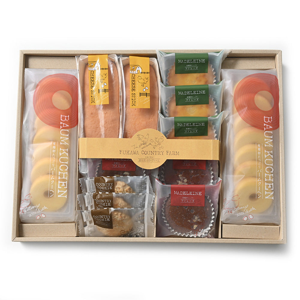 のびのび育った鶏から取れた有精卵を、た~っぷり使った贅沢&こだわりのスイーツを製造・販売している深川カントリーファーム自慢のスイーツセットのご紹介です。ふんわりやさしい口どけが印象的なバームクーヘンや、大人からお子様まで幅広い年代の方に愛されるマドレーヌなど人気の洋菓子を詰め合わせ。