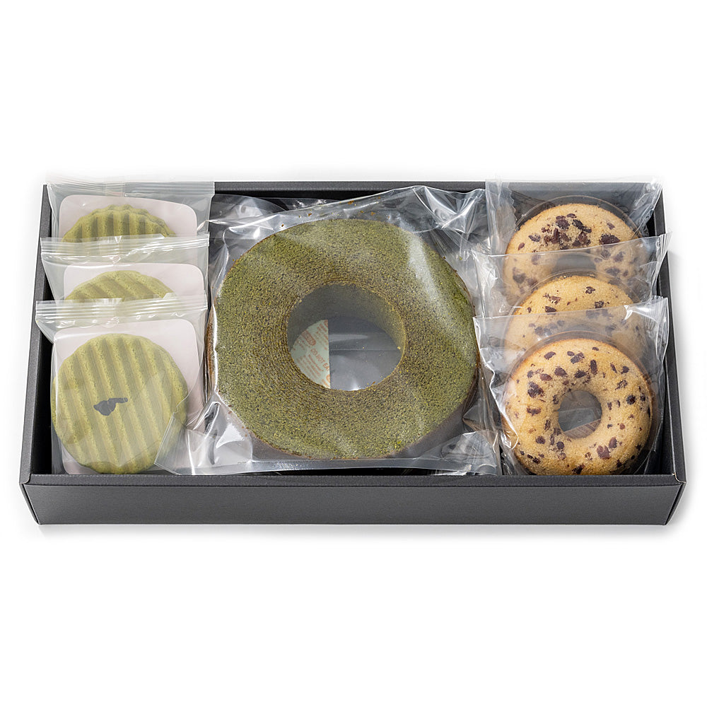- セット内容:宇治抹茶バウムクーヘン×1個、小豆ドーナツ×3個、ヴァッフェル×3個