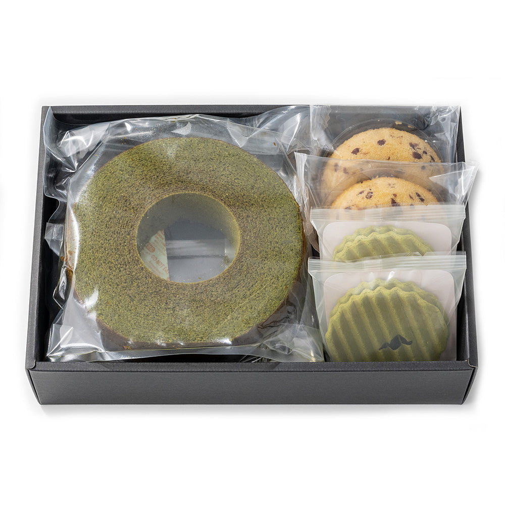 - セット内容:宇治抹茶バウムクーヘン×1個、小豆ドーナツ×2個、ヴァッフェル×2個