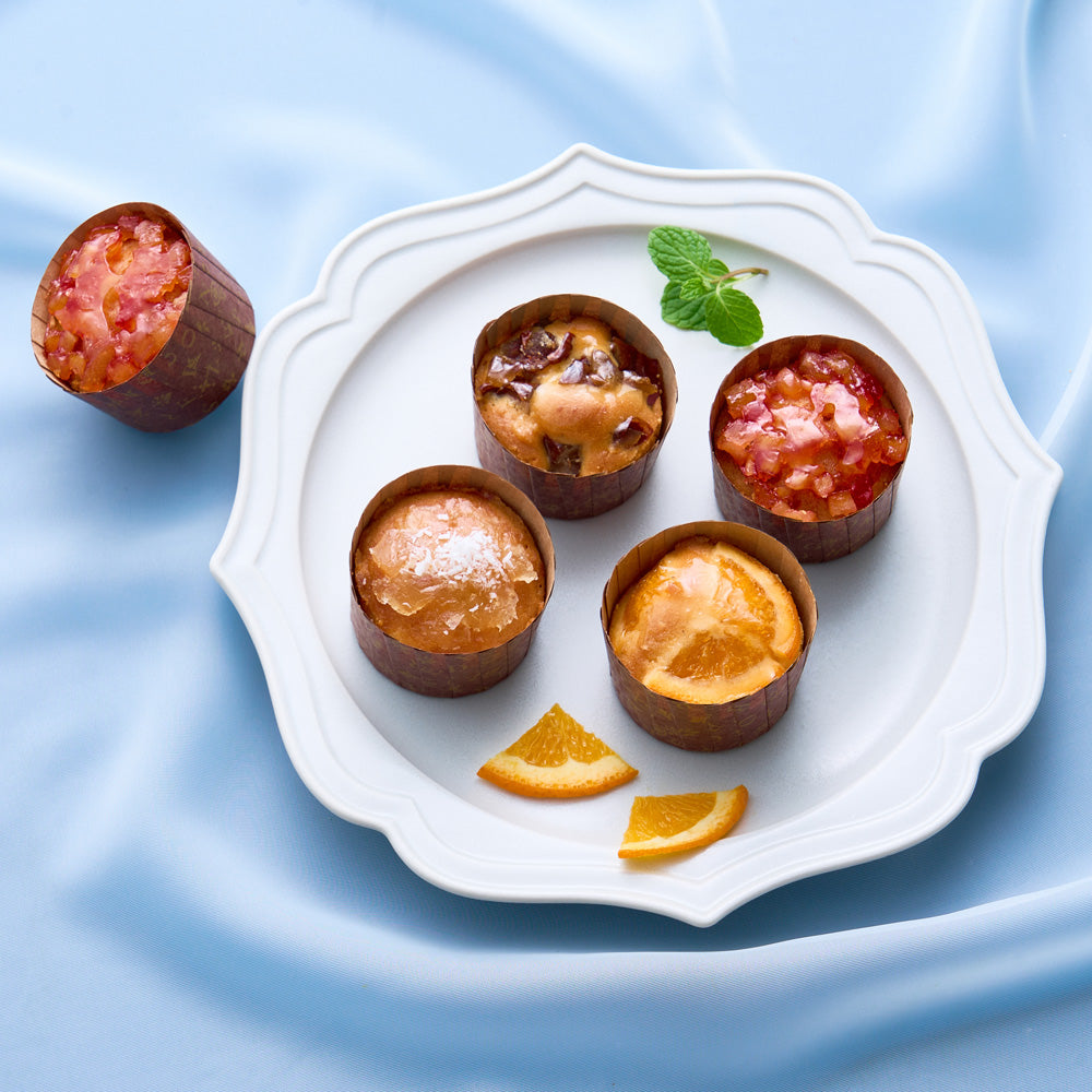 艶っと光るシロップ漬けの果実や、セミドライの果実がジュエリーのようなカップケーキです。空気をたっぷり含ませて焼きあげた、果実入りのなめらかな生地に煌めく果実たちをトッピングして、果実を味わうカップケーキに仕上げました。