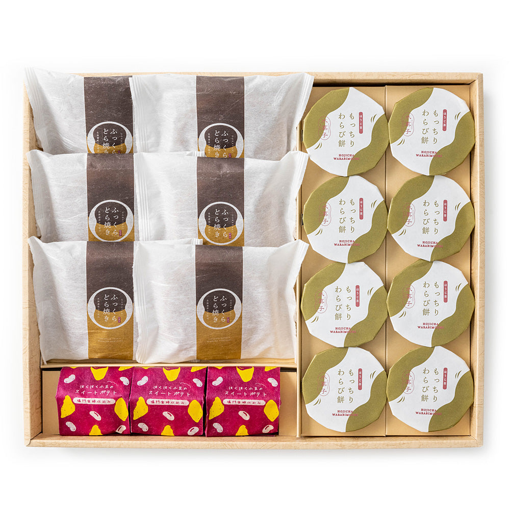 - セット内容:ふっくらどら焼き×6個、もっちりわらび餅×8個、ほくほく小豆のスイートポテト×3個
