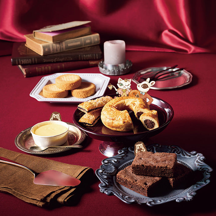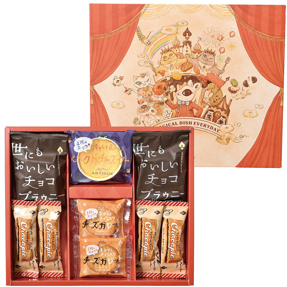 - セット内容:サクサクチョコパイ×4個、ホワイトチョコ入りチーズガレット・世にもおいしいチョコブラウニー×各2個、冷やして食べる!ベイクドチーズケーキ×1個
