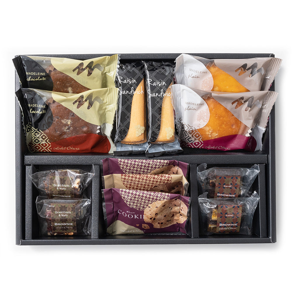 - セット内容:ブラウニー(ネーブル・ドライフルーツ&ナッツ)・レーズンサンド・マドレーヌ(プレーン・チョコ)・レーズンクッキー×各2個、チョコチップクッキー×1個