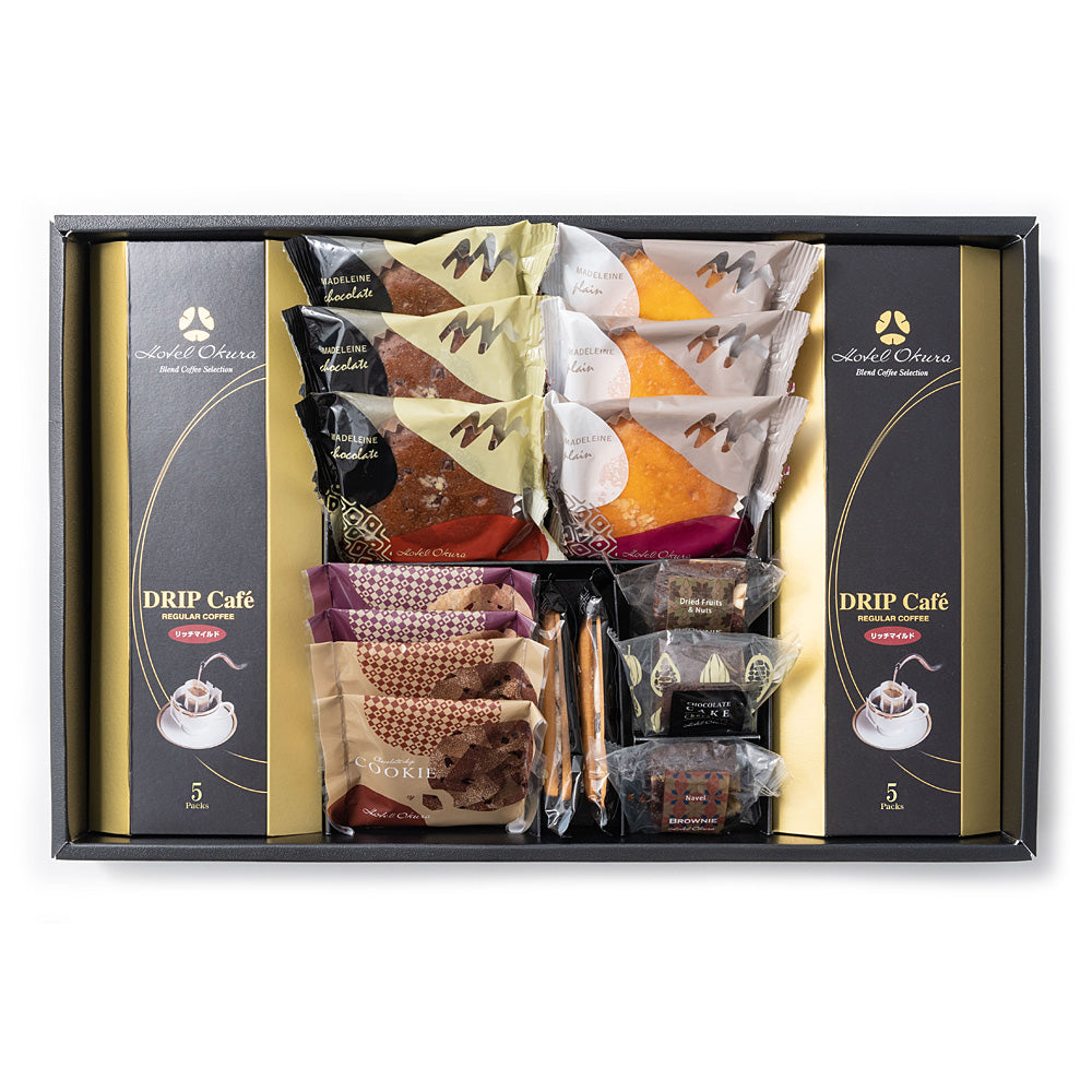 ホテルオークラの焼菓子とドリップ珈琲の詰合せ。しっとりした焼きあがりのマドレーヌやレーズンサンドなどさまざまな焼菓子を取り揃えているのにも、選ぶ、味わう楽しさを届けたいというおもてなしの心を感じて頂けるセットとなっています。焼菓子に良くあう上品な味わいのドリップ珈琲と一緒にご堪能ください。