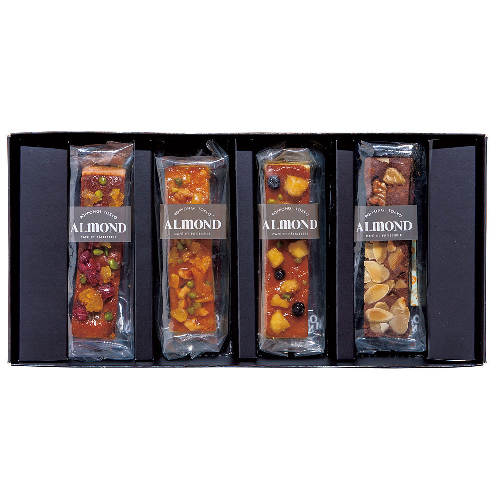 瑞々しいドライフルーツと香ばしいナッツをたっぷり使ってデコレーションした見た目にも華やかな、4種類のスティック型のケーキです。