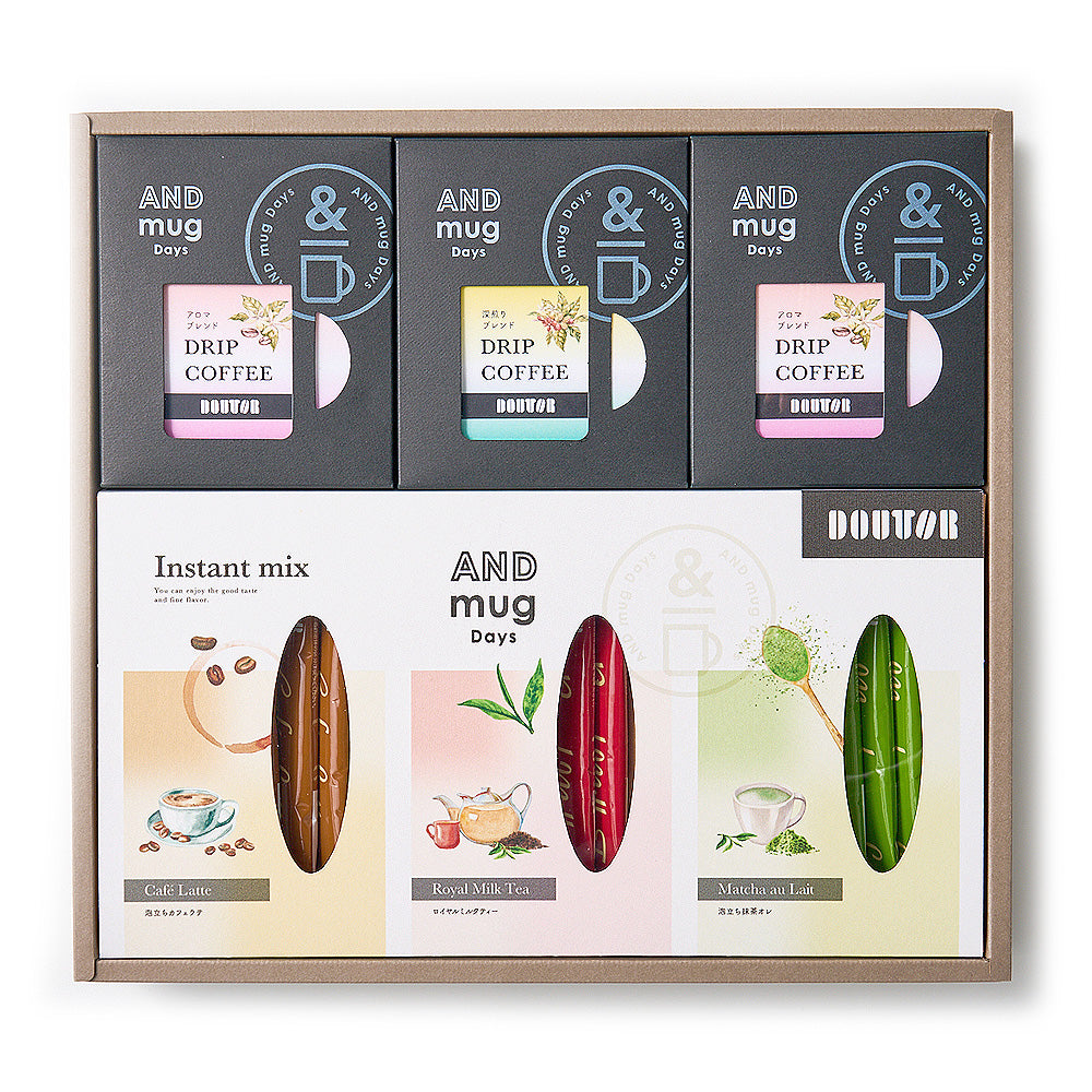 - セット内容:ドリップパック(アロマブレンド4P×2個、深煎りブレンド4P×1個)、インスタントスティック(泡立ちカフェラテ・ロイヤルミルクティー・泡立ち抹茶オレ×各6本)