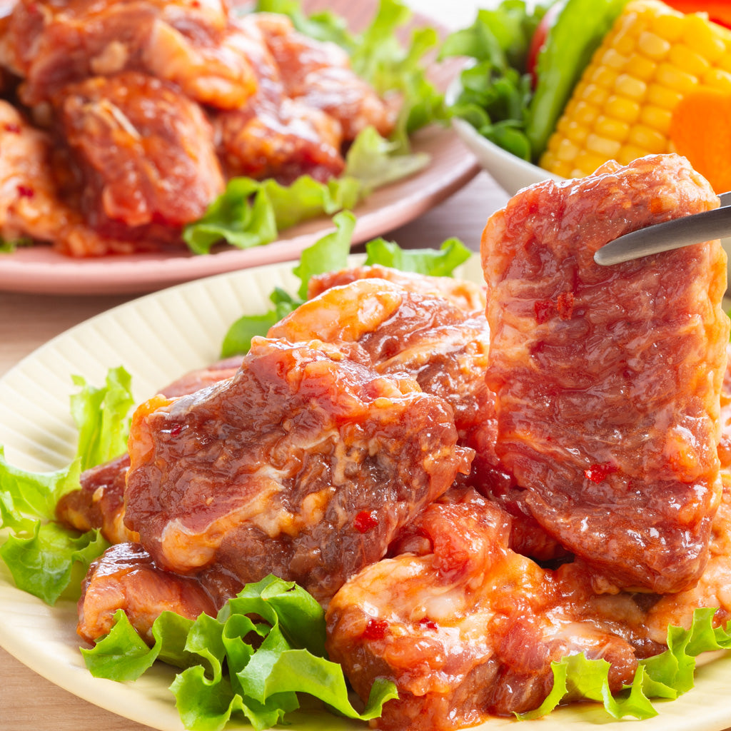 旨味が強い赤身とジューシーな脂身のバランスが良い中落カルビと、牛一頭から数%しか取れないハラミをりんごの甘みと香味野菜のコクのある特製タレに漬け込みました。