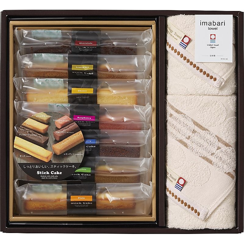 - 商品内容:セット内容/スティックケーキ(プレーン・チョコ・ラズベリー・チーズ・ピスタチオ・レモンティ)×各1、フェイスタオル(34×80cm)・ウォッシュタオル(34×35cm)×各1 材質/タオル:綿100% 箱サイズ/29.5×32×5cm 賞味期限/常温5ヶ月 アレルゲン/卵・乳・小麦 機能/今治マーク/第2017-1925号