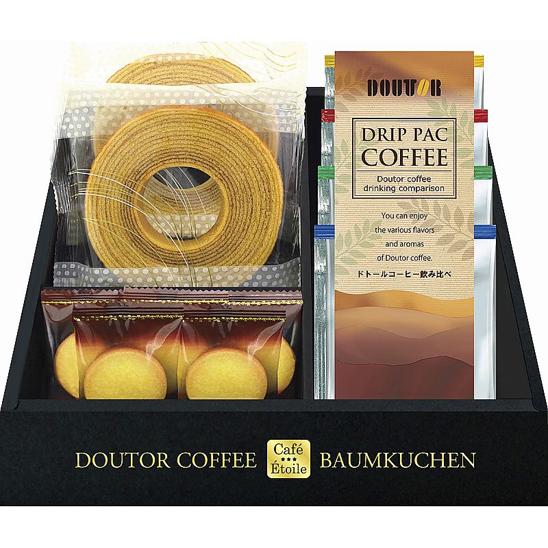 - 商品内容:セット内容/プレーンクッキー×5、ミルクバウムクーヘン×2、ドトールドリップコーヒー(深煎りブレンド・キリマンジャロブレンド・モカブレンド・アロマブレンド)×各1 箱サイズ/23×26×6.5cm 箱入重量/0.4kg 賞味期限/常温6ヶ月 アレルゲン/卵・乳・小麦