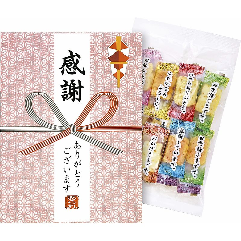 国産もち米使用。普段言葉では言い表せない「感謝のきもち」を個包装にデザインしました。中身はソフトに焼き上げた上品な味わいは幅広い年代の方に召し上がって頂けます。