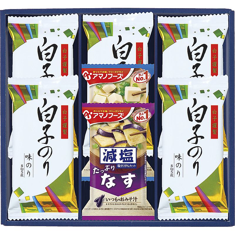 - 商品内容:セット内容/白子のり味のり(8切5枚)×5、アマノフーズ減塩いつものおみそ汁(とうふ・なす)×各1 箱サイズ/24.2×26.6×4.5cm 箱入重量/0.2kg 賞味期限/常温1年 アレルゲン/小麦・えび