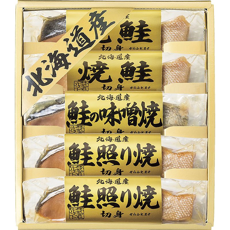 - 商品内容:セット内容/焼鮭切身・鮭照り焼切身(各30g)×各2、鮭の味噌焼切身(30g)×1 箱サイズ/23×20×4.5cm 箱入重量/0.4kg 賞味期限/常温1年 アレルゲン/小麦