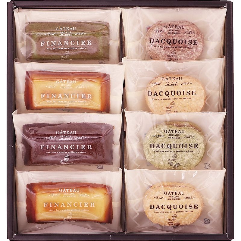 - 商品内容:セット内容/ダックワーズ(プラリネ)・フィナンシェ(プレーン)×各2、ダックワーズ(ショコラ・抹茶)・フィナンシェ(ショコラ・抹茶)×各1 箱サイズ/23.5×22×5.5cm 箱入重量/0.4kg 賞味期限/常温5ヶ月 アレルゲン/卵・乳・小麦