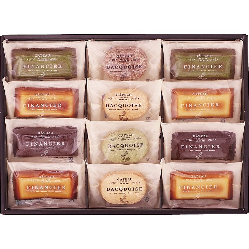- 商品内容:セット内容/フィナンシェ(プレーン)×4、ダックワーズ(プラリネ)・フィナンシェ(ショコラ・抹茶)×各2、ダックワーズ(ショコラ・抹茶)×各1 箱サイズ/23.5×32.5×5.5cm 箱入重量/0.5kg 賞味期限/常温5ヶ月 アレルゲン/卵・乳・小麦