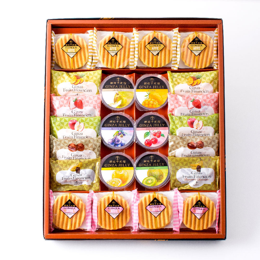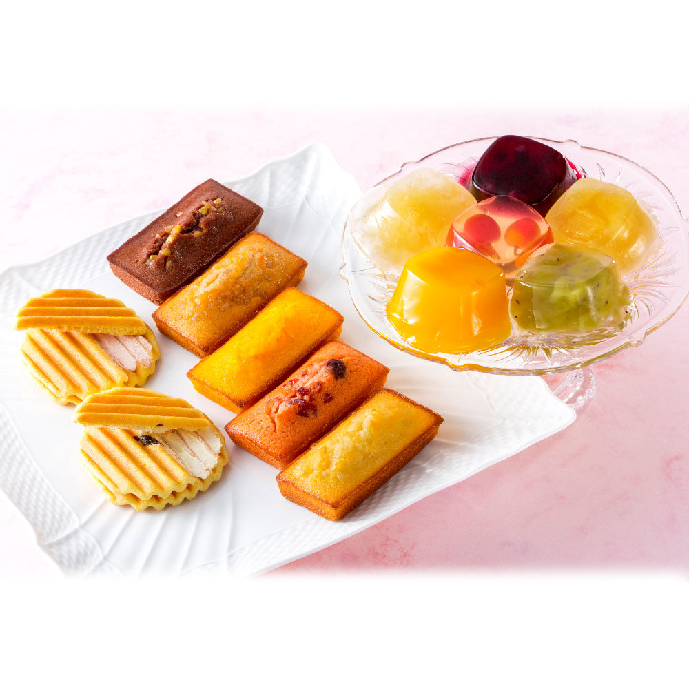 バターとアーモンドプードルで焼き上げた香り高いフランスの銘菓「フィナンシェ」。厳選したフルーツの果肉をたっぷり使用した「ゼリー」。柔らかなクリームを挟んだ「ヴァッフェル」。ボリュームもたっぷりに、バラエティ豊かに詰め合わせました。
