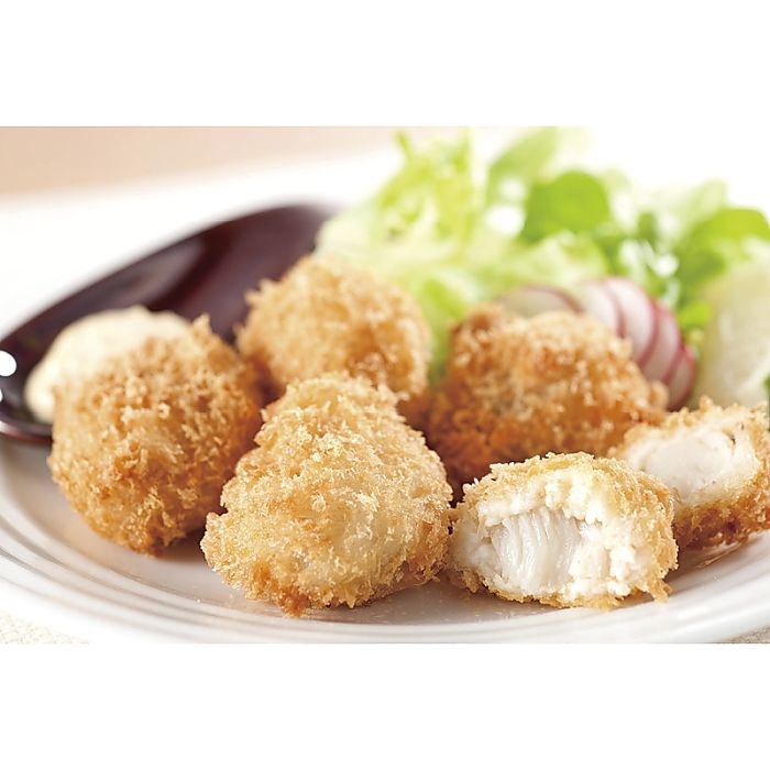 本場、青森陸奥湾で獲れたホタテを使用。ジューシーで甘いホタテの旨味を楽しめます。パン粉を手付けしているので、さっくりとした食感に揚がります。