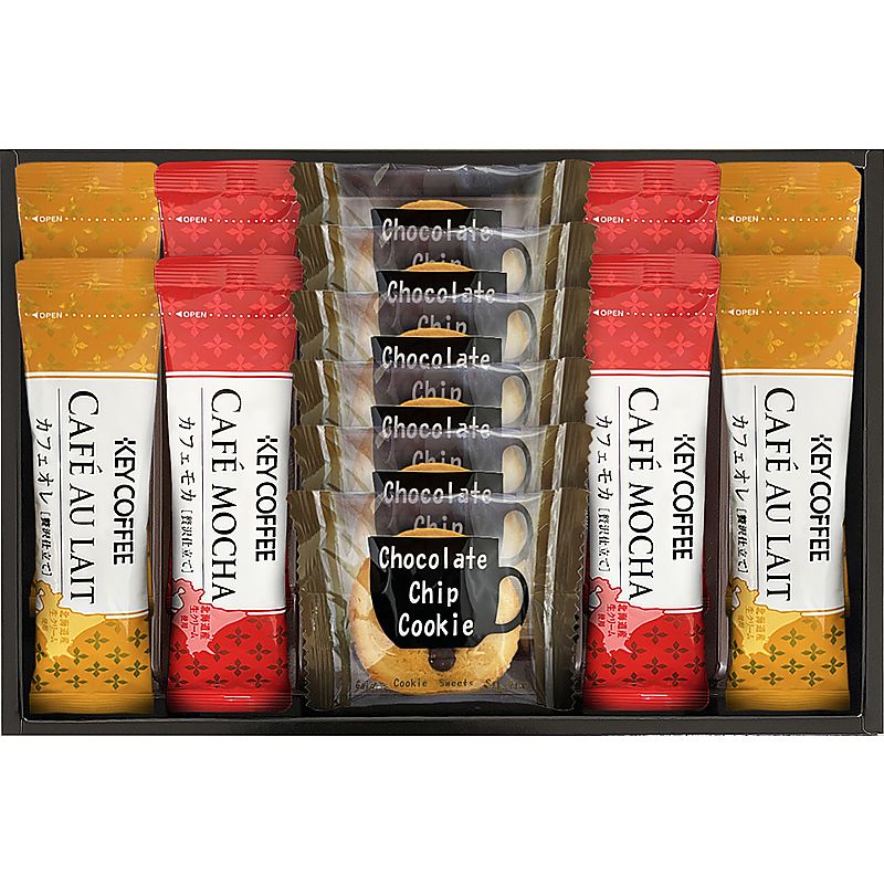 - 商品内容:セット内容/チョコチップクッキー×6、キーコーヒーカフェモカスティック(7.8g)・キーコーヒーカフェオレスティック(7g)×各4 箱サイズ/19×28×3.8cm 箱入重量/0.3kg 賞味期限/常温6ヶ月 アレルゲン/卵・乳・小麦