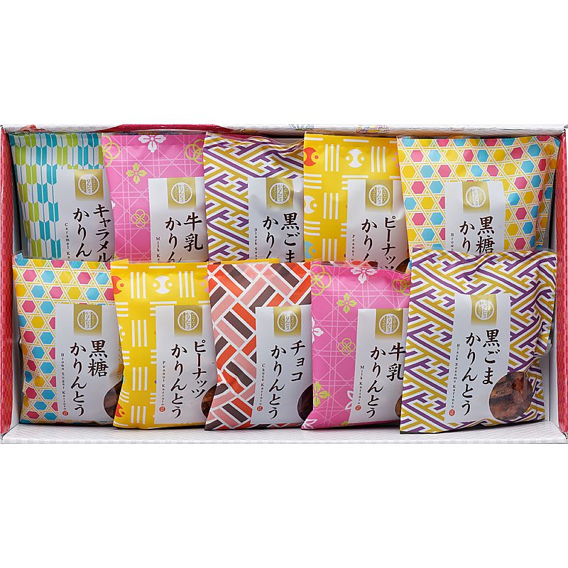 - 商品内容:セット内容/黒ごまかりんとう・黒糖かりんとう・牛乳かりんとう・ピーナッツかりんとう(各45g)×各2、チョコかりんとう・キャラメルかりんとう(各45g)×各1 箱サイズ/23.5×42.5×7cm 箱入重量/0.7kg 賞味期限/常温4ヶ月 アレルゲン/乳・小麦・落花生