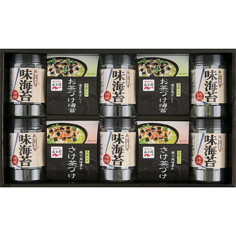 - 商品内容:セット内容/柳川海苔味付け海苔(8切32枚)×6、永谷園お茶づけ海苔(6.3g×3袋)・永谷園さけ茶づけ(5.6g×3袋)×各2 箱サイズ/28×47.5×8cm 箱入重量/1.1kg 賞味期限/常温1年 アレルゲン/小麦