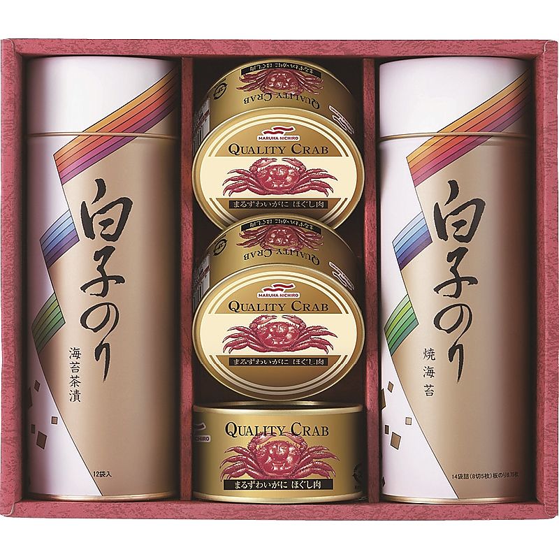- 商品内容:セット内容/まるずわいがにほぐし肉(110g)×3、焼のり14袋詰(8切5枚)・のり茶漬け(12袋)×各1 箱サイズ/23.5×27.5×9cm 箱入重量/1.47kg 賞味期限/常温3年 アレルゲン/乳・小麦・かに