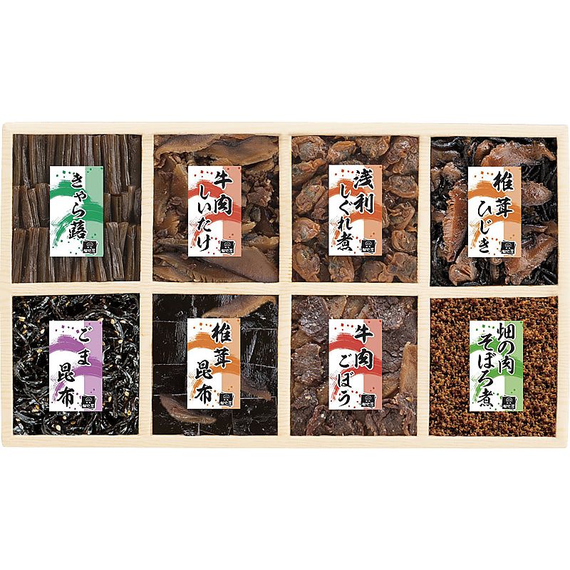- 商品内容:セット内容/きゃら蕗・ごま昆布・椎茸昆布(各60g)・牛肉しいたけ・浅利しぐれ煮・椎茸ひじき・牛肉ごぼう・畑の肉そぼろ煮(各50g)×各1 箱サイズ/23×39.4×3.8cm 箱入重量/0.7kg 賞味期限/常温140日 アレルゲン/小麦