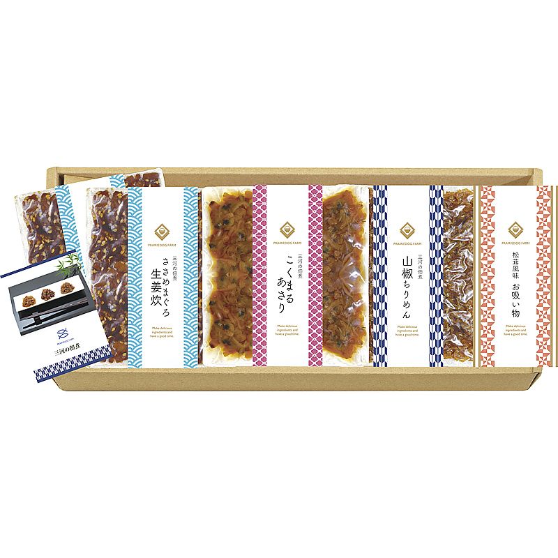 - 商品内容:セット内容/お吸いもの・ささめまぐろ生姜炊(40g)×各2、こくまるあさり・山椒ちりめん(各40g)×各1 箱サイズ/18×31.5×2.5cm 箱入重量/0.32kg 賞味期限/常温6ヶ月 アレルゲン/乳・小麦