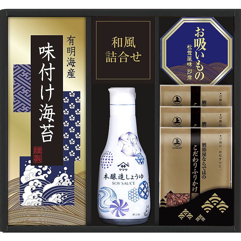 - 商品内容:セット内容/こだわりふりかけ(6g)×3、ヤマサ鮮度卓上しょうゆ(200ml)・有明海産味付け海苔(3切6枚)・永谷園お吸いもの松茸風味(2.3g×2袋)×各1 箱サイズ/25×27×7cm 箱入重量/0.6kg 賞味期限/常温1年 アレルゲン/小麦