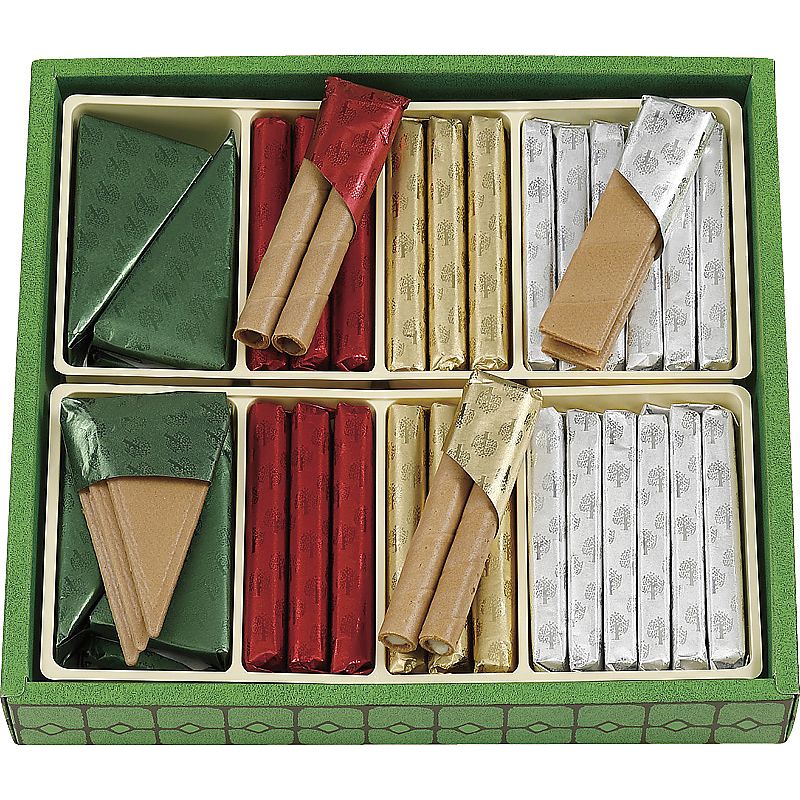 - 商品内容:セット内容/三角(3枚入)×8、短冊(2枚入)×12、丸型(ミルクチョコ・ホワイトチョコ)(各2本入)×各6 箱サイズ/25×26×3.8cm 箱入重量/0.5kg 賞味期限/常温6ヶ月 アレルゲン/卵・乳・小麦