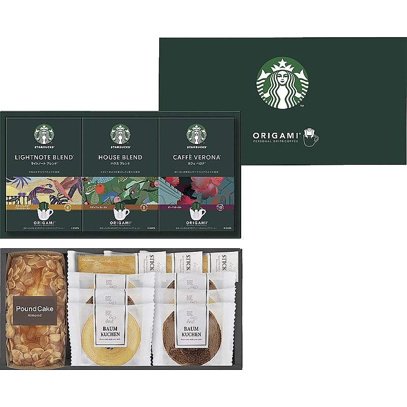 - 商品内容:セット内容/バウムクーヘン(ココア・バニラ)・スティックパイ(プレーン)×各3、スターバックスオリガミドリップコーヒー(ハウスブレンド・カフェベロナ・ライトノートブレンド)(各9g×4p)・アーモンドパウンドケーキ×各1 箱サイズ/19×31.5×14.5cm 箱入重量/1.16kg 賞味期限/常温4ヶ月 アレルゲン/卵・乳・小麦