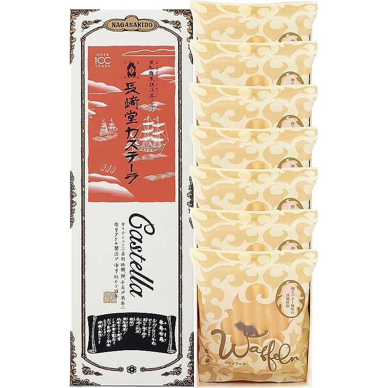 - 商品内容:セット内容/ヴァッフェル×7、カステーラ(5切入×2袋)×1 箱サイズ/28×17×6.5cm 箱入重量/0.8kg 賞味期限/常温50日 アレルゲン/卵・乳・小麦