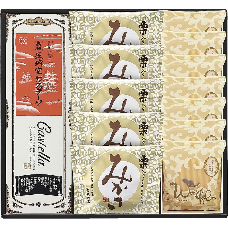 - 商品内容:セット内容/ヴァッフェル×7、栗みかさ×5、カステーラ(5切入×2袋)×1 箱サイズ/30×33×7cm 箱入重量/1.3kg 賞味期限/常温50日 アレルゲン/卵・乳・小麦