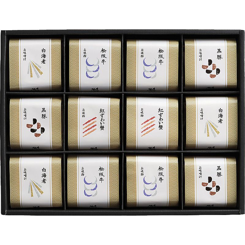 - 商品内容:セット内容/本格和風だしお吸物(松阪牛)×4、本格和風だしお味噌汁(黒豚・白海老)×各3、本格和風だしお吸物(紅ずわい蟹)×2 箱サイズ/25.5×33.5×5.5cm 箱入重量/.5 賞味期限/6ヶ月 アレルゲン/小麦・えび・かに