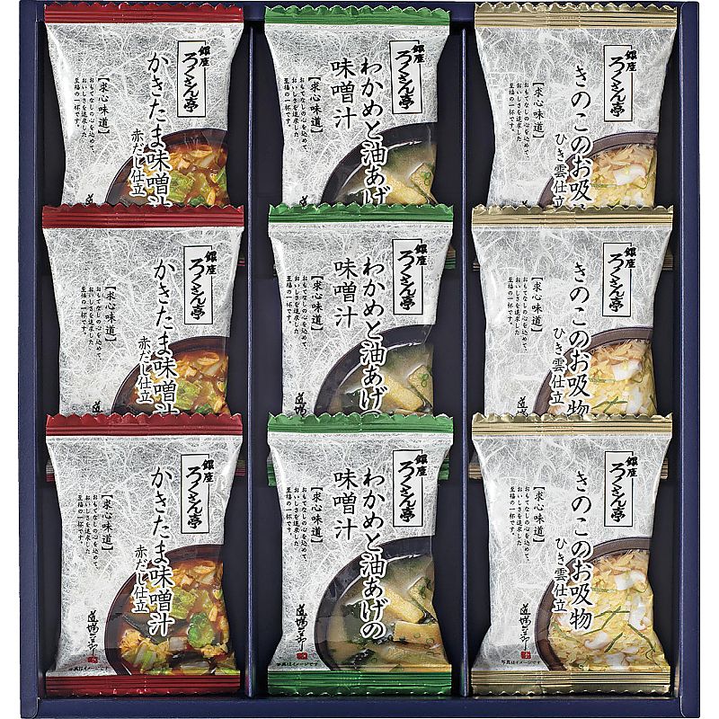 - 商品内容:セット内容/きのこのお吸物ひき雲仕立・わかめと油あげの味噌汁・かきたま味噌汁赤だし仕立×各3 箱サイズ/26×25×3.2cm 箱入重量/.2 賞味期限/1年 アレルゲン/卵・小麦