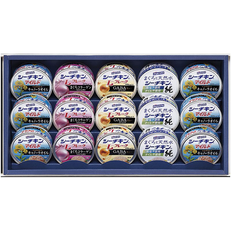 - 商品内容:セット内容/シーチキンマイルドキャノーラオイル(70g)×6、シーチキンLフレーク(コラーゲン入り・GABA入り)・まぐろと天然水で作ったシーチキン純(各70g)×各3 箱サイズ/21.5×40.1×6.7cm 箱入重量/1.8kg 賞味期限/常温3年