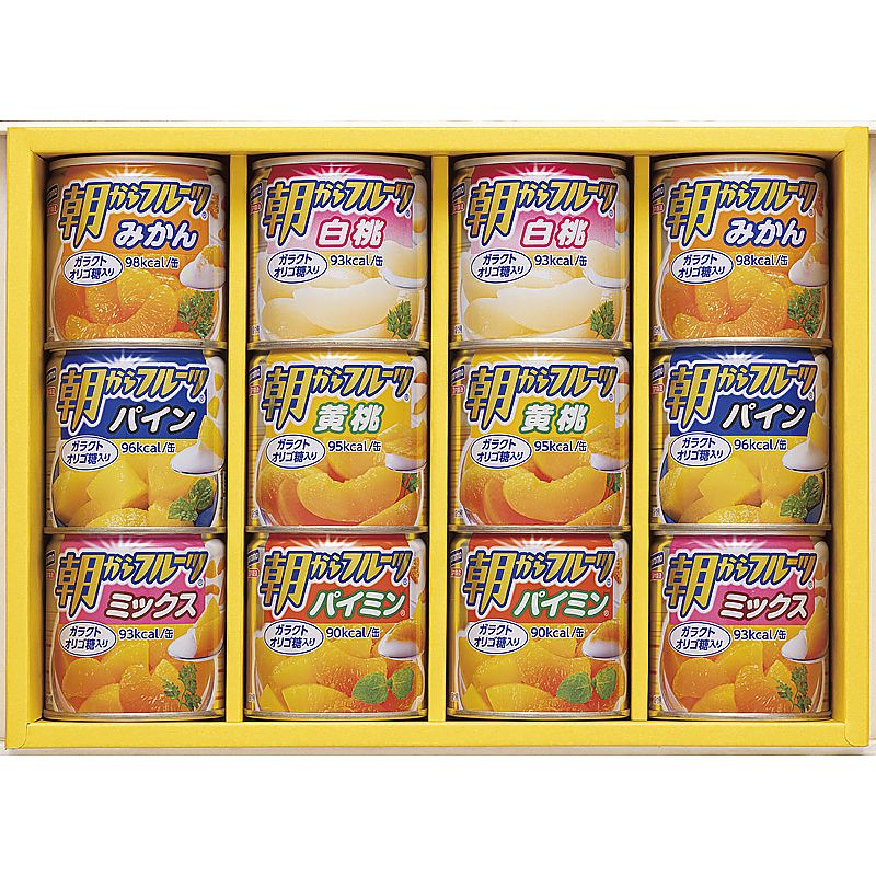 - 商品内容:セット内容/朝からフルーツ(みかん・パイン・ミックス・白桃・黄桃・パイミン)(各190g)×各2 箱サイズ/22.7×31.5×7.5cm 箱入重量/3 賞味期限/3年