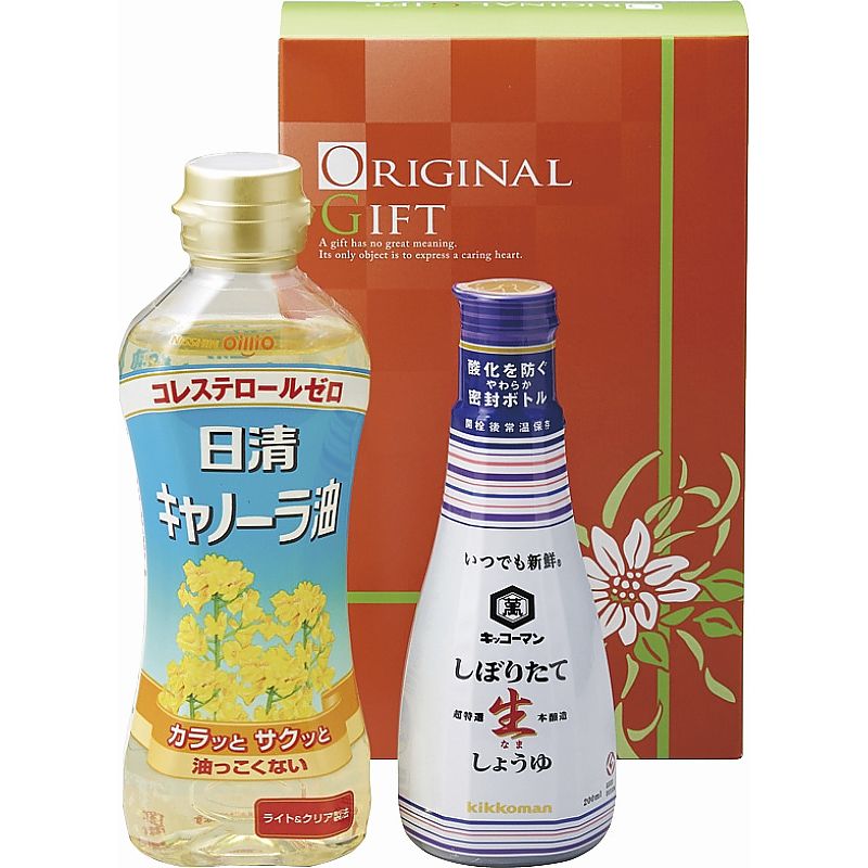 - 商品内容:セット内容/日清キャノーラ油(350g)・キッコーマンしぼりたて生しょうゆ(200ml)×各1 箱サイズ/22.3×14×6.3cm 箱入重量/0.7kg 賞味期限/1年 アレルゲン/小麦