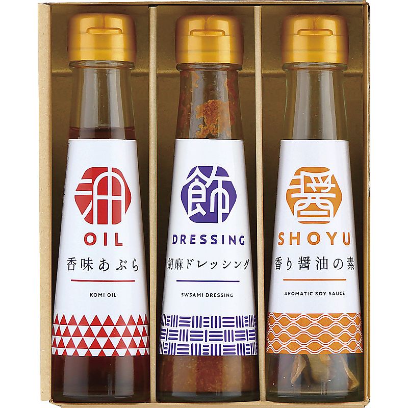- 商品内容:セット内容/胡麻ドレッシング(100ml)・香味あぶら(90g)・香り醤油の素(4.5g)×各1 箱サイズ/18.5×14.5×5.2cm 箱入重量/0.7kg 賞味期限/常温1年 アレルゲン/小麦