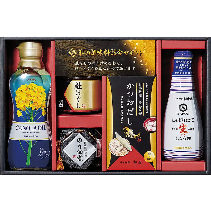 - 商品内容:セット内容/昭和キャノーラ油(300g)・キッコーマンしぼりたて生しょうゆ(200ml)・のり佃煮(80g)・鮭ほぐし(50g)・かつおだし(4g×8袋)×各1 箱サイズ/20.5×31×7.5cm 箱入重量/1.38kg 賞味期限/常温1年 アレルゲン/乳・小麦