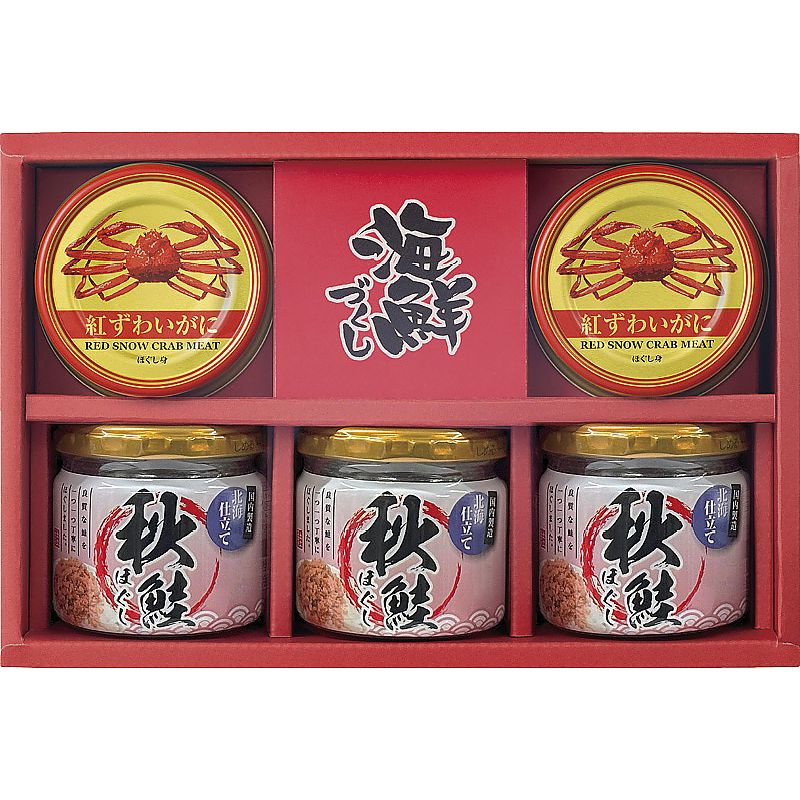 - 商品内容:セット内容/秋鮭ほぐし(50g)×3、紅ずわいがに(ほぐし身)(55g)×2 箱サイズ/16×24.5×7cm 箱入重量/0.8kg 賞味期限/常温1年 アレルゲン/小麦・かに