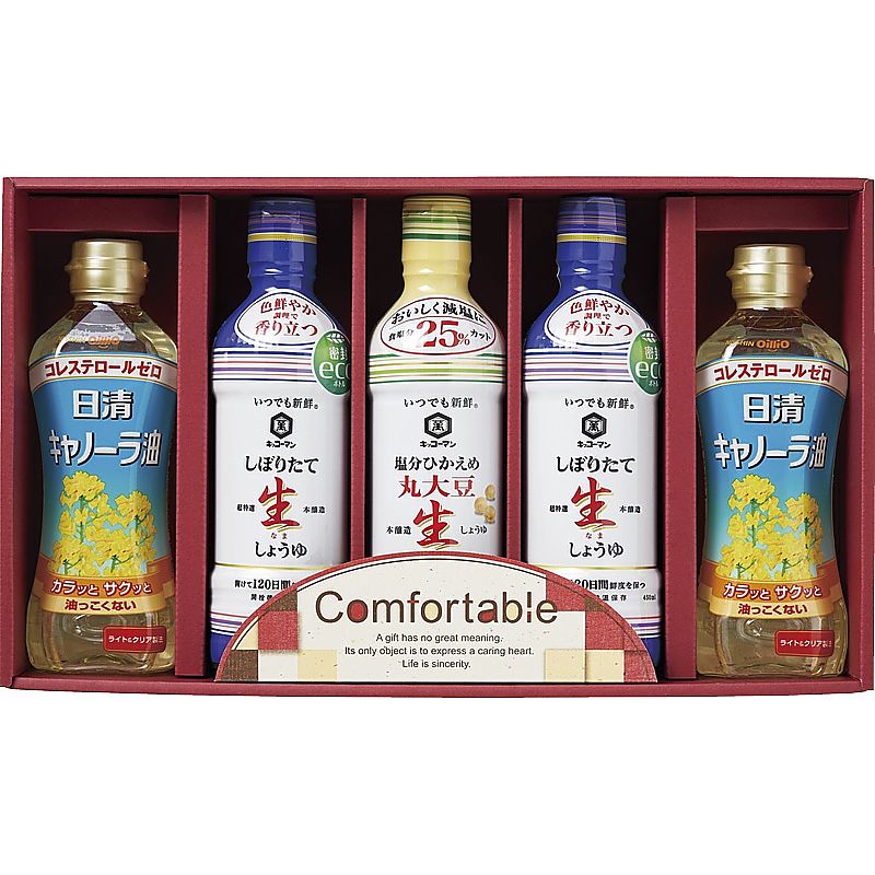 - 商品内容:セット内容/日清キャノーラ油(350g)・キッコーマンしぼりたて生しょうゆ(450ml)×各2、キッコーマン塩分ひかえめ丸大豆生しょうゆ(450ml)×1 箱サイズ/23.4×39.5×7.1cm 箱入重量/2.9kg 賞味期限/常温1年 アレルゲン/小麦