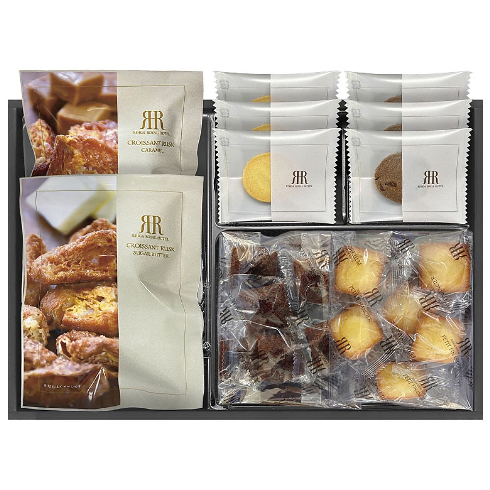 - 商品内容:セット内容/クッキー(プレーンバニラ・チョコチップ)×各3、クロワッサンラスク(シュガーバター風味・キャラメル)・プチフィナンシェ(プレーン・ショコラ)(各6個入)×各1 箱サイズ/22×32×6cm 箱入重量/0.425kg 賞味期限/常温3ヶ月 アレルゲン/卵・乳・小麦