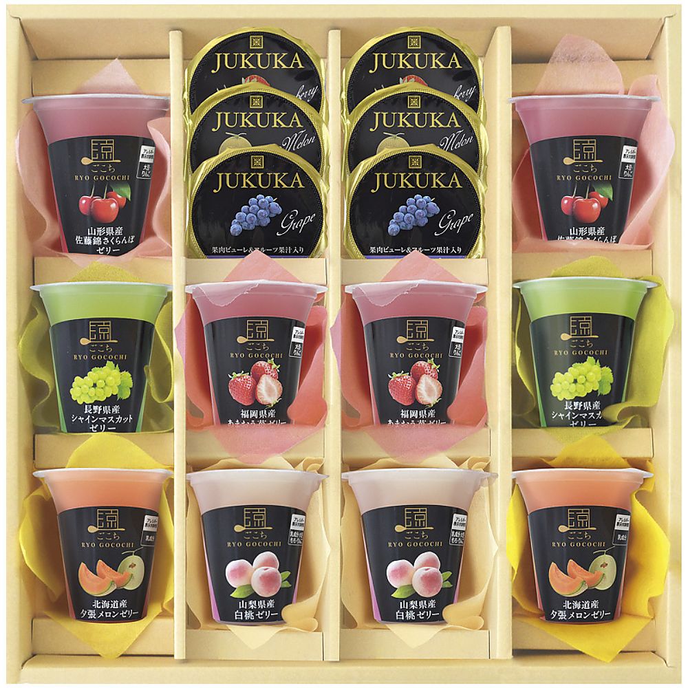 さくらんぼの王様とも評される山形県産の佐藤錦果汁を使用したさくらんぼゼリーや、マスカットの芳香を持つ長野県産シャインマスカットの果汁を使用したマスカットゼリー、北海道を代表する高品質の果実「夕張メロン」の果汁を使用したメロンゼリーなどの詰合せです。