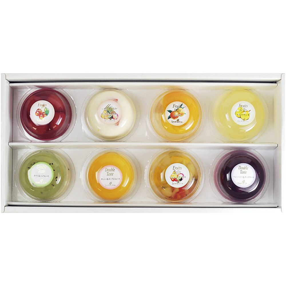 - 商品内容:セット内容/フルーツゼリー(フルーツミックス・ラフランス・さくらんぼ)・ダブルテイスト(ブルーベリー&チーズケーキ・キウイ&ミルクムース・オレンジ&ヨーグルトムース)(各95g)・フルーツゼリー(あんず・ミックスヨーグルトムース)(各90g)×各1 箱サイズ/18×35×5.5cm 箱入重量/1.1kg 賞味期限/常温6ヶ月 アレルゲン/乳